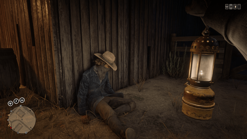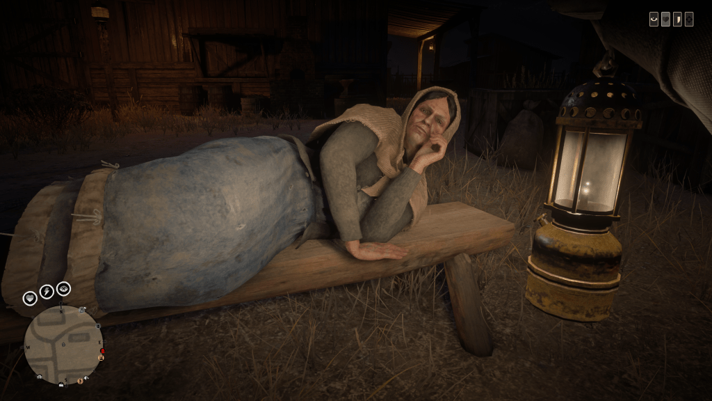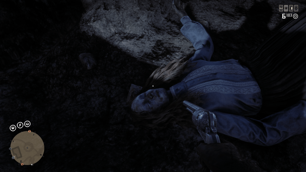 You can argue that the whole area of Armadillo is surrounded in legend and cursed by a prominent character from the first title, the “Strange Man”. What you can’t argue with is residents lying on benches wearing face masks, the detailed in-game weather effects are well known but to this date I’ve never come across an NPC using a banana in rain or snow. Again it could simply be a symptom of an upcoming dust storm but plague seems logical if not more exciting. What is most interesting is the graves around Armadillo seem to now be littered with diseased and deformed bodies. One of the take away pieces of evidence is featured below, deformed corpses that seem actually give an option to pick up and de spawn after being shot in the head.Before taking the screenshot I did get a little trigger happy and decided to shoot most of the corpses in the head this confirmed they are not just deco.